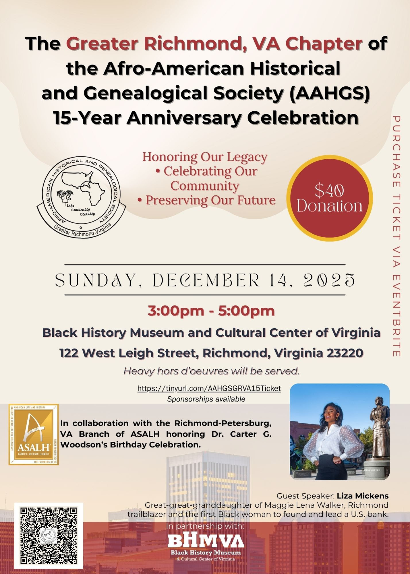 The Afro-American Historical and Genealogical Society (AAHGS) Greater Richmond, Virginia Chapter is officially celebrating 15 incredible years of honoring our legacy, celebrating our community, and preserving our future.